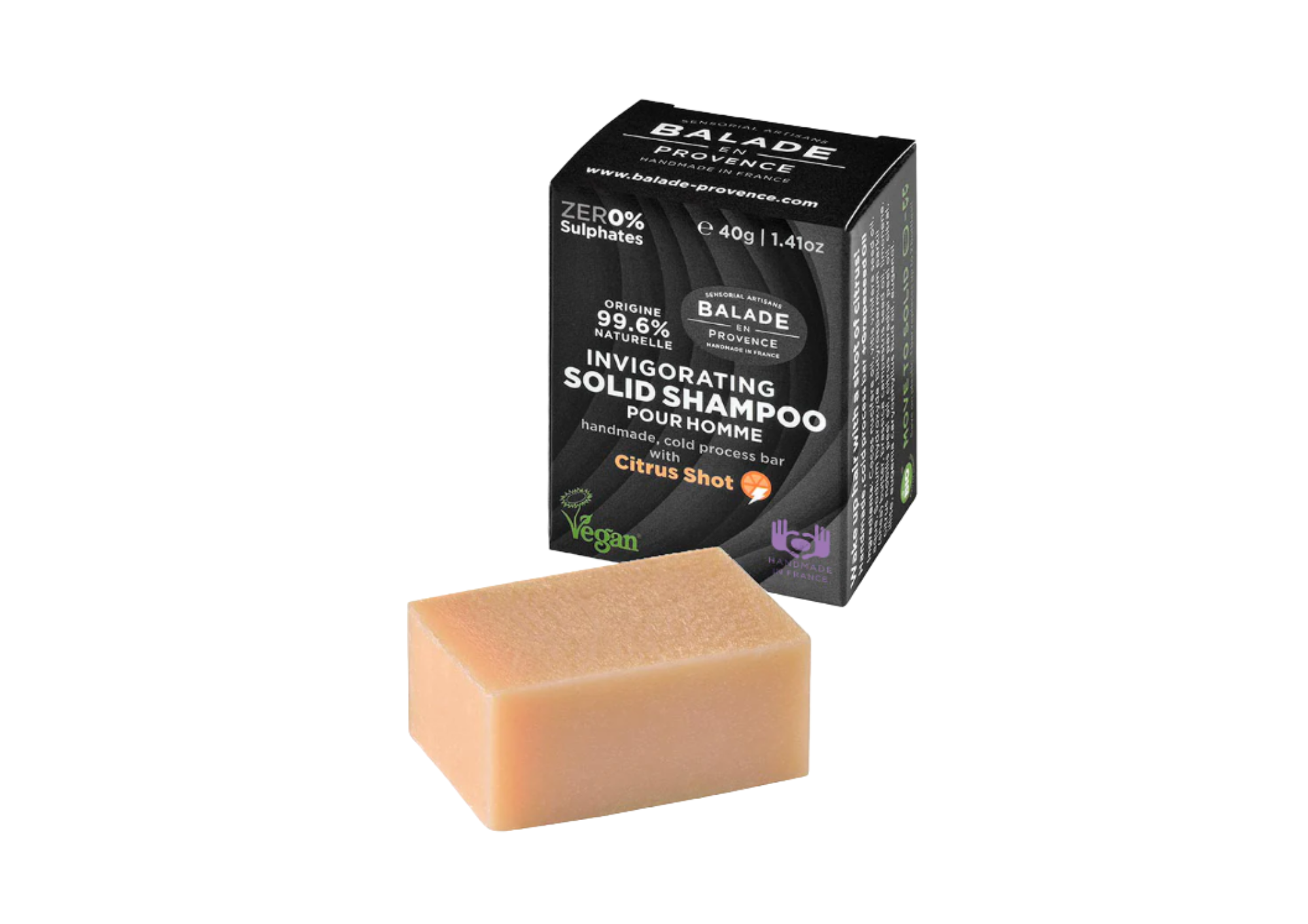 Сертифицираният органичен твърд шампоан за мъже на Balade en Provence съдържа 99,6% натурални съставки, включително цитрусови есенциални масла, кокосово масло, масло от гроздови семки, рапично масло и масло от ший. Без сулфати, той хидратира скалпа и прави косата по-силна и блестяща. Един бар заменя до две бутилки течен шампоан.